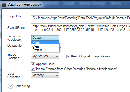 The sign-in procedure is a part of the scraping project. The program does not require any previously created login information. This is the most reliable approach for a scheduled execution. It is important for the project to start clean to be processed always in the same manner. To force the clean “not signed” state, set the project Cookies policy to “Clear”. A log-in form can be automated as any other input form by selecting user name, password fields and the submit button.