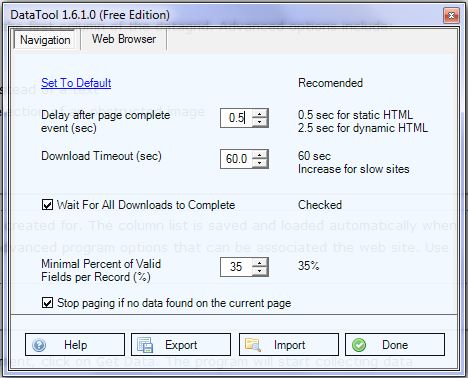 ata Toolbar associates the column list with the web site for which it has been created. The column list is saved and loaded automatically when you close or open the wizard. Besides the column list there are some advanced program options that can be associated with the web site. Select Options to manage advanced project settings. The Options screen allow you to change download rules for "Details" and "Next" web pages, and export or import a project as text file. Do not change the project settings unless you need to resolve a problem.
