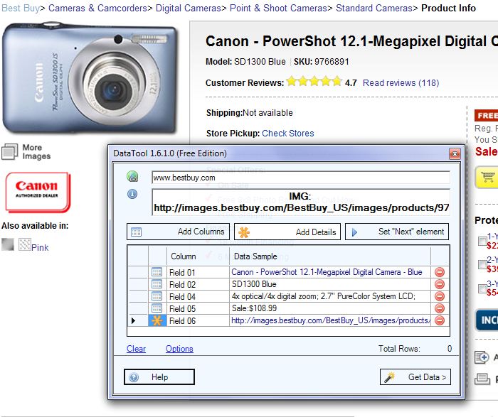 In this walkthrough we will use a product catalog (a list of Canon cameras) from www.bestbuy.com web site. To start the DataTool wizard click on the DataTool button in the toolbar area of Internet Explorer.