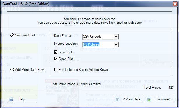 The Save Data screen presents two options: Saving Data and Adding More Data Rows. Pressing the Continue button on the Save Data Screen will default to Save and Exit. The program can save data as either a CSV, XML or HTML table. These formats can be easily imported into an Excel or Google spreadsheet. If you have added image collection as well, select the desired location of the downloaded images on your computer. Selecting Web location will keep references to the original image locations on the Web. Checking the Open File checkbox opens a generated data file as soon as it gets created.