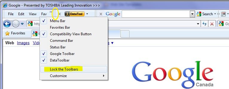 Data Toolbar does not need much space. Right click anywhere in the toolbar area of Internet Explorer and make sure that the Lock the Toolbars menu item is Off. Then drag the Data Toolbar to put it on the same line as the Menu Bar or another toolbar that you have. On the picture below the Menu Bar, the Data Toolbar and the Google toolbar share the same horizontal bar.